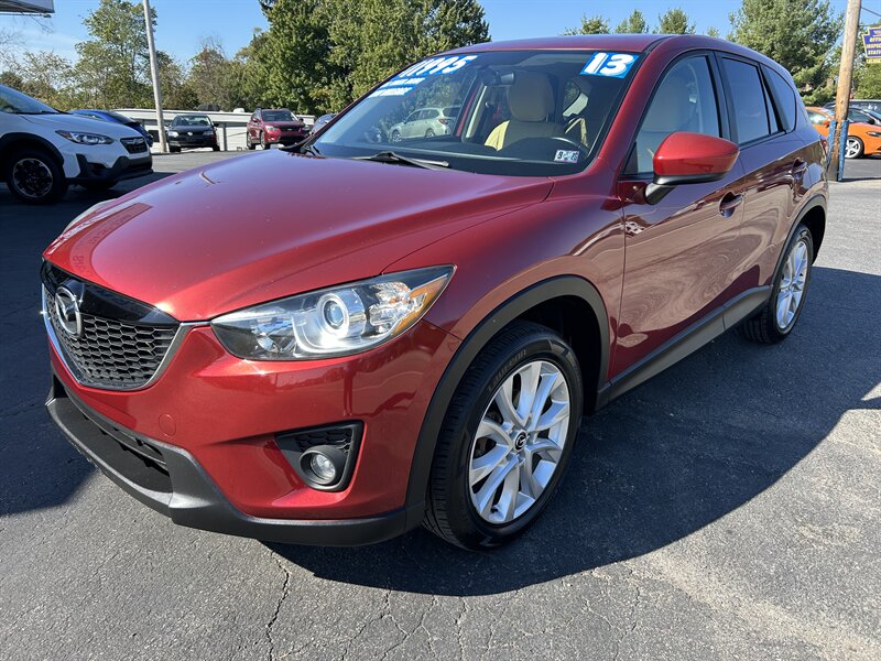 Completely serviced and ready to go with a new PA state inspection. Introducing the 2013 Mazda CX-5 Grand Touring, a versatile compact SUV that combines efficiency with style. Powered by a SKYACTIV-G 2.0L I4 engine, it delivers 155 horsepower and 150 ft-lbs of torque, offering a responsive driving experience. With less than 79,000 miles on the odometer, averaging less than 7,000 miles per year, this vehicle has been well-maintained. The CX-5 Grand Touring comes equipped with an array of factory default features, including a premium sound system, leather-trimmed upholstery for added comfort and style. It also boasts Bluetooth connectivity, blind spot monitoring and a rearview camera for enhanced convenience and safety. The vehicle's fuel efficiency is notable, achieving 25 MPG in the city and 31 MPG on the highway, making it an ideal choice for both urban driving and long road trips. Experience the blend of practicality and performance with the Mazda CX-5 Grand Touring.